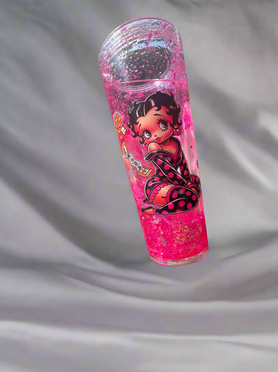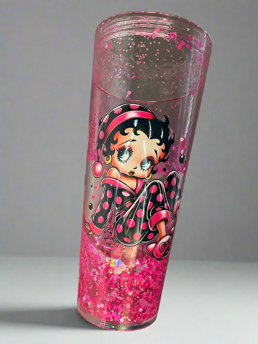 Introducing Sexy Betty's latest addition to our product line: the 24oz Acrylic Glitter Tumbler. This stunning tumbler features the iconic Betty Boop, adding a touch of glamour to your daily routine. And with its durable acrylic material and eye-catching glitter design, this tumbler is perfect for a lava flow cup, adding a little sparkle to your drink.